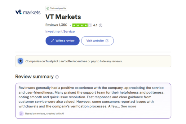 VT Markets nhận được hơn 1.300 đánh giá với điểm số 4.1/5 trên Trustpilot – một trong những nền tảng đánh giá uy tín nhất toàn cầu. Đa số người dùng đánh giá cao dịch vụ thân thiện, đội ngũ hỗ trợ nhanh chóng và nhiệt tình, cũng như quy trình xử lý yêu cầu mượt mà.